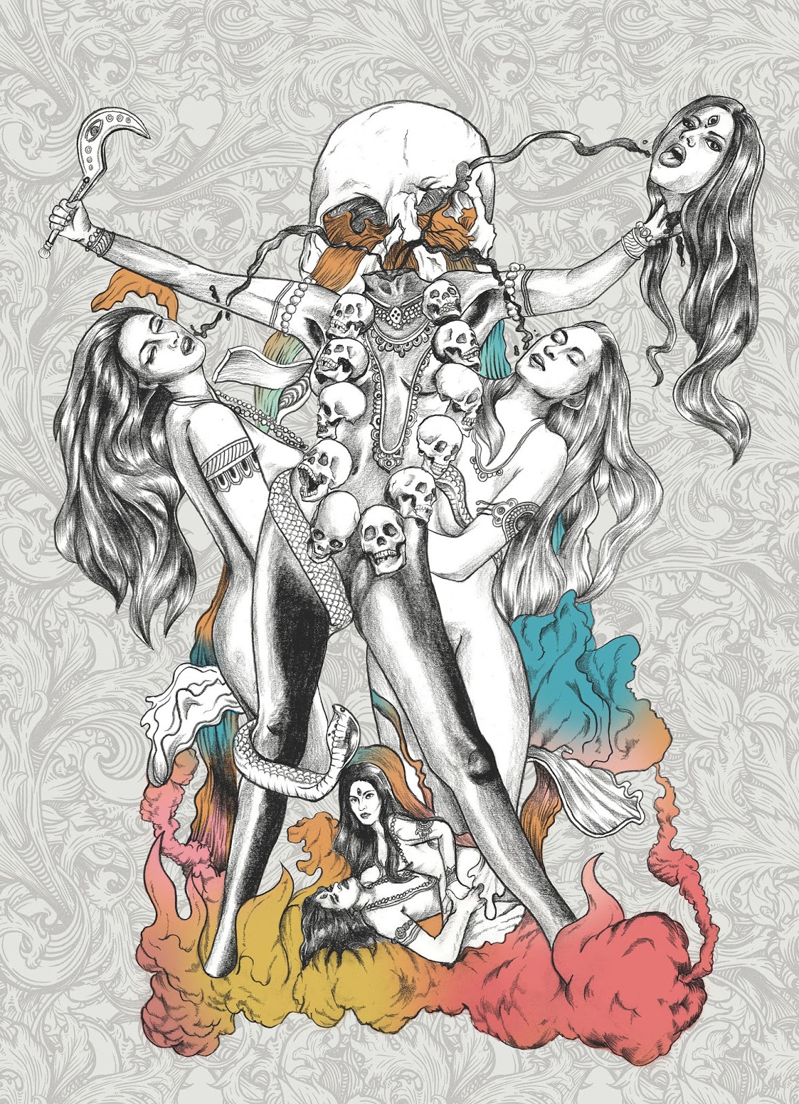 Stories of her origin vary, but one relates that Parvati was bathing with two attendants, Jaya and Vijaya, when the attendants asked the Goddess to satisfy their hunger. After putting them off several times, Parvati looked all around and then cut off her own head. Three streams of blood came from her neck—one went to the mouth of Jaya, one to the mouth of Vijaya, and the last to the mouth of Parvati herself. At this point, Parvati is transformed into the Goddess Chinnamasta, whose name literally means “severed head.” When they were satisfied, she put her head back on, became Parvati again, and went home. In other versions, the attendants are named Dakini and Varnini, and Chinnamasta is standing on a couple in the middle of having sex. The couple is Rati, Goddess of sexual desire, and her husband Kama, God of love.